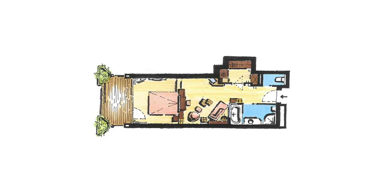 South or west facing suite with big balcony,generously proportioned living room with a beautiful panoramic view, spring water - well, bathroom with bathtub, shower, hair-dryer, seperated WC and bidet, telephone, two flat-TVs with cable - TV, radio, safe, internetconnection
