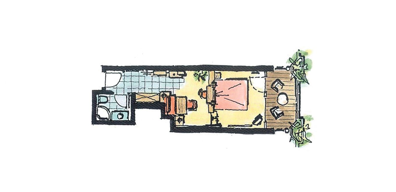 - Living area with table, bench and armchair