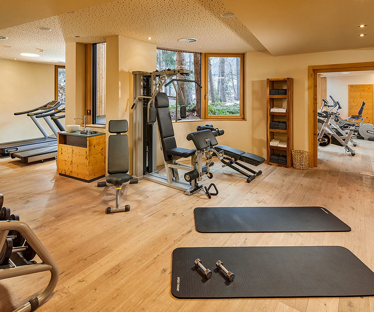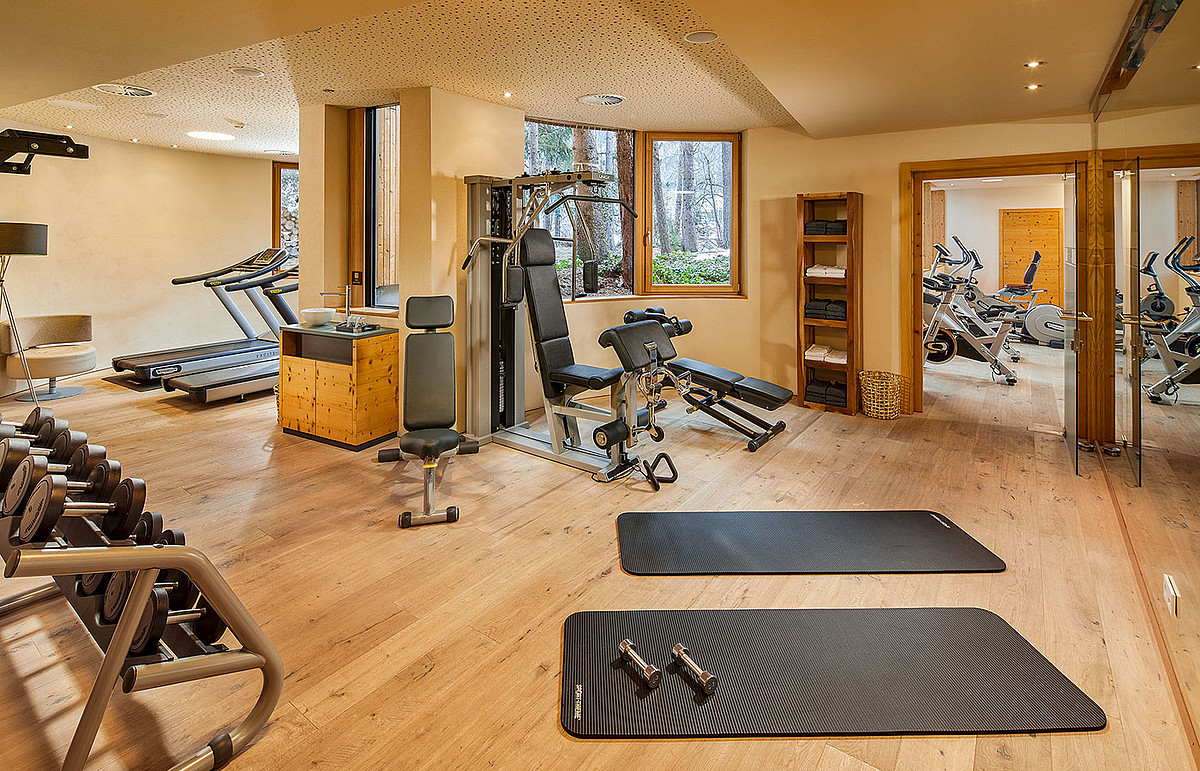 Es muss nicht immer ans Limit gehen – darf es aber. Der Fitnessraum bietet den Rahmen dafür: modern ausgestattet, lichtdurchflutet und mit Blick in die Bergwelt.