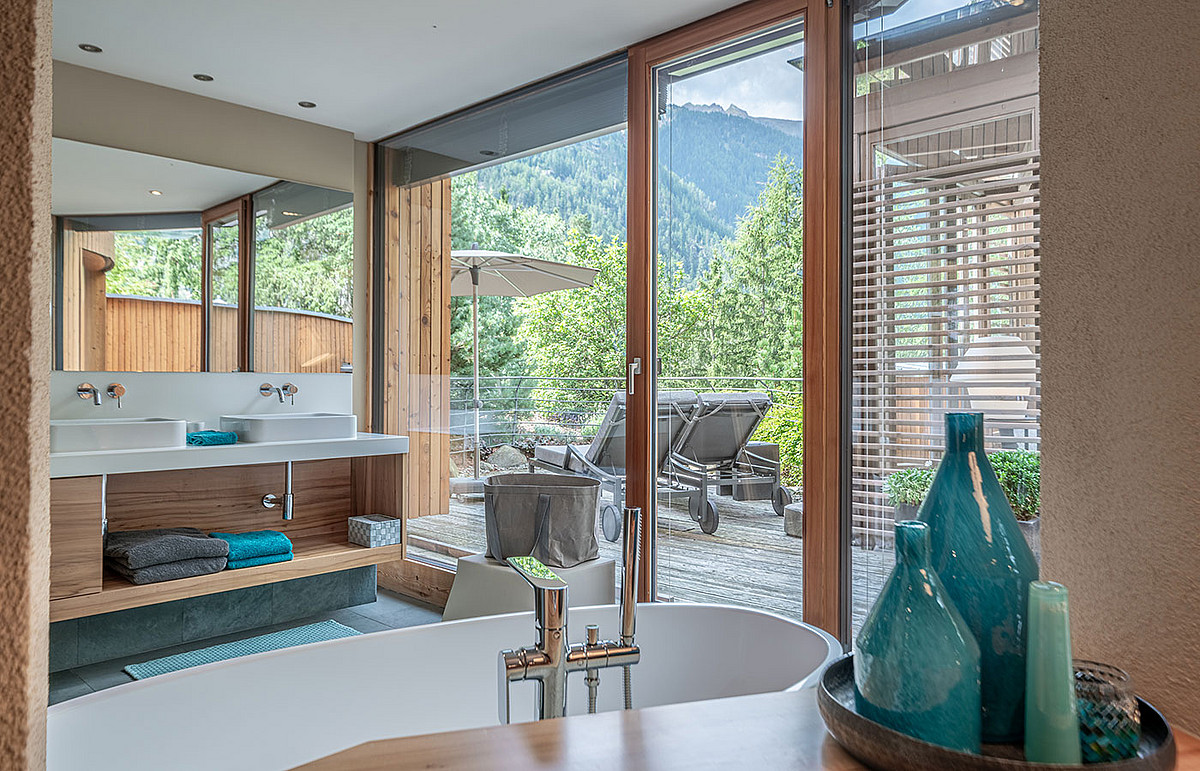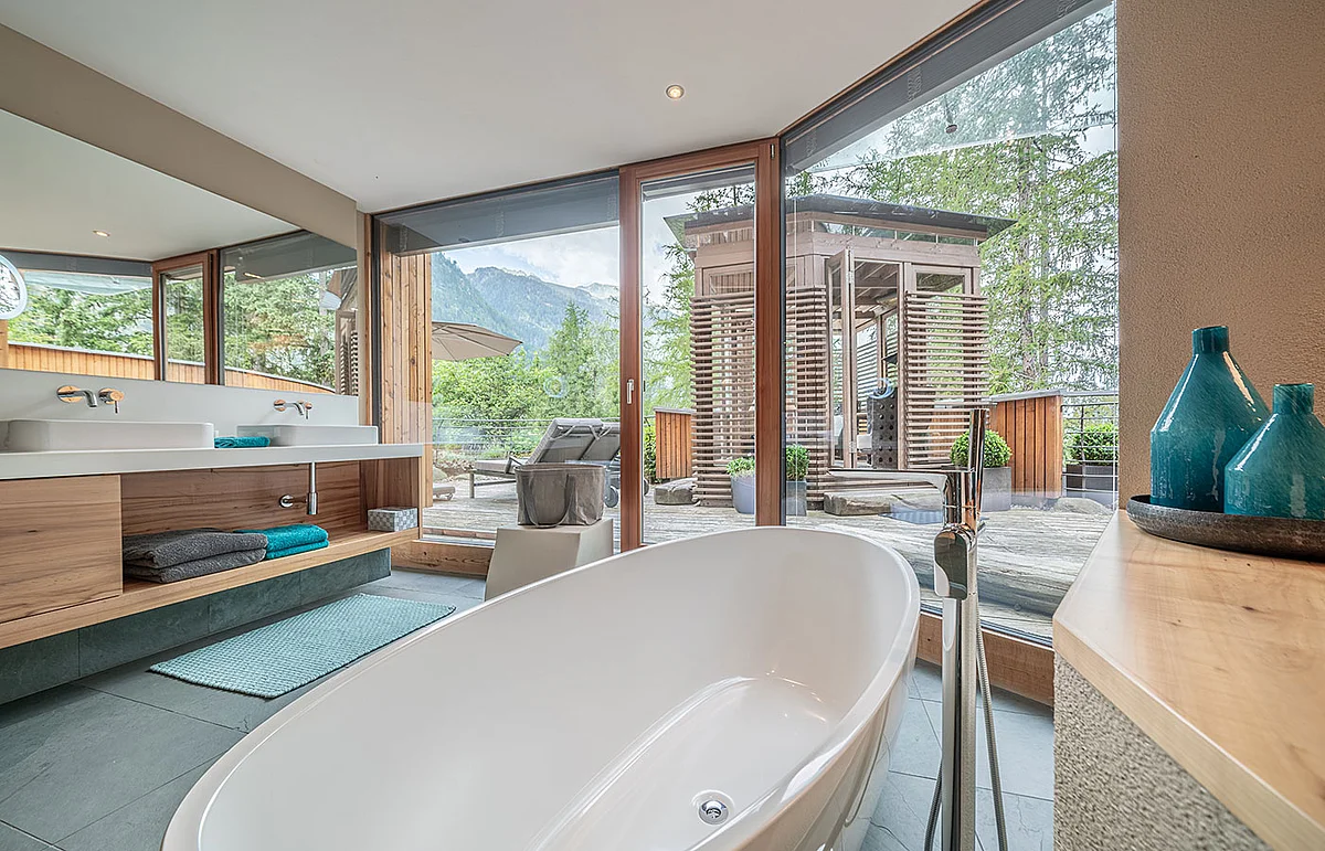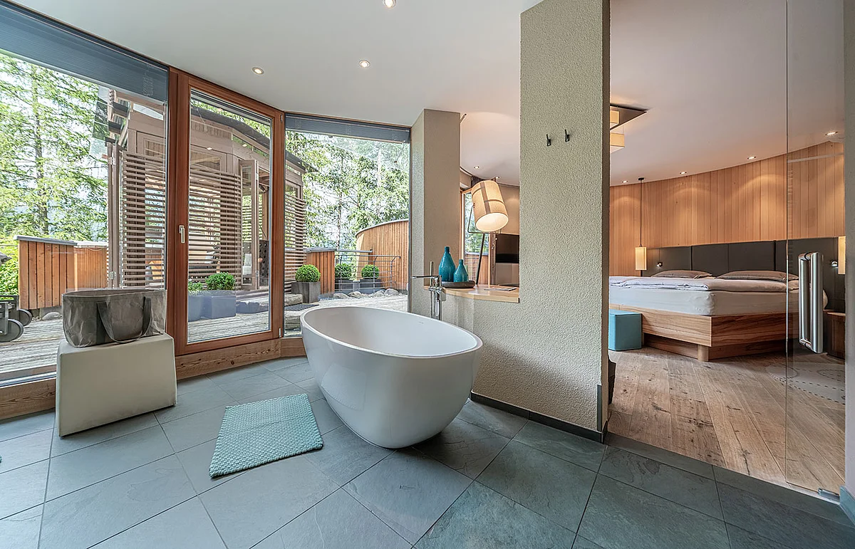 • offenes Badezimmer mit Dusche und freistehender Badewanne mit Waldblick, getrenntes WC mit Bidet