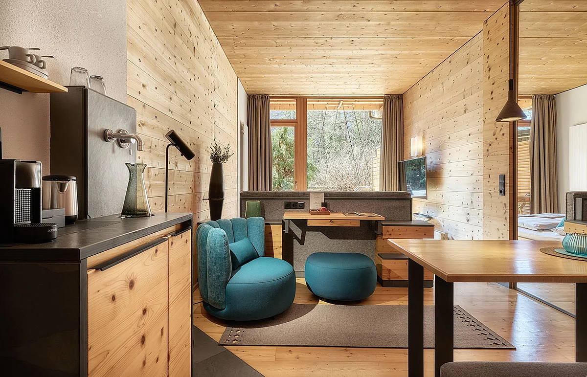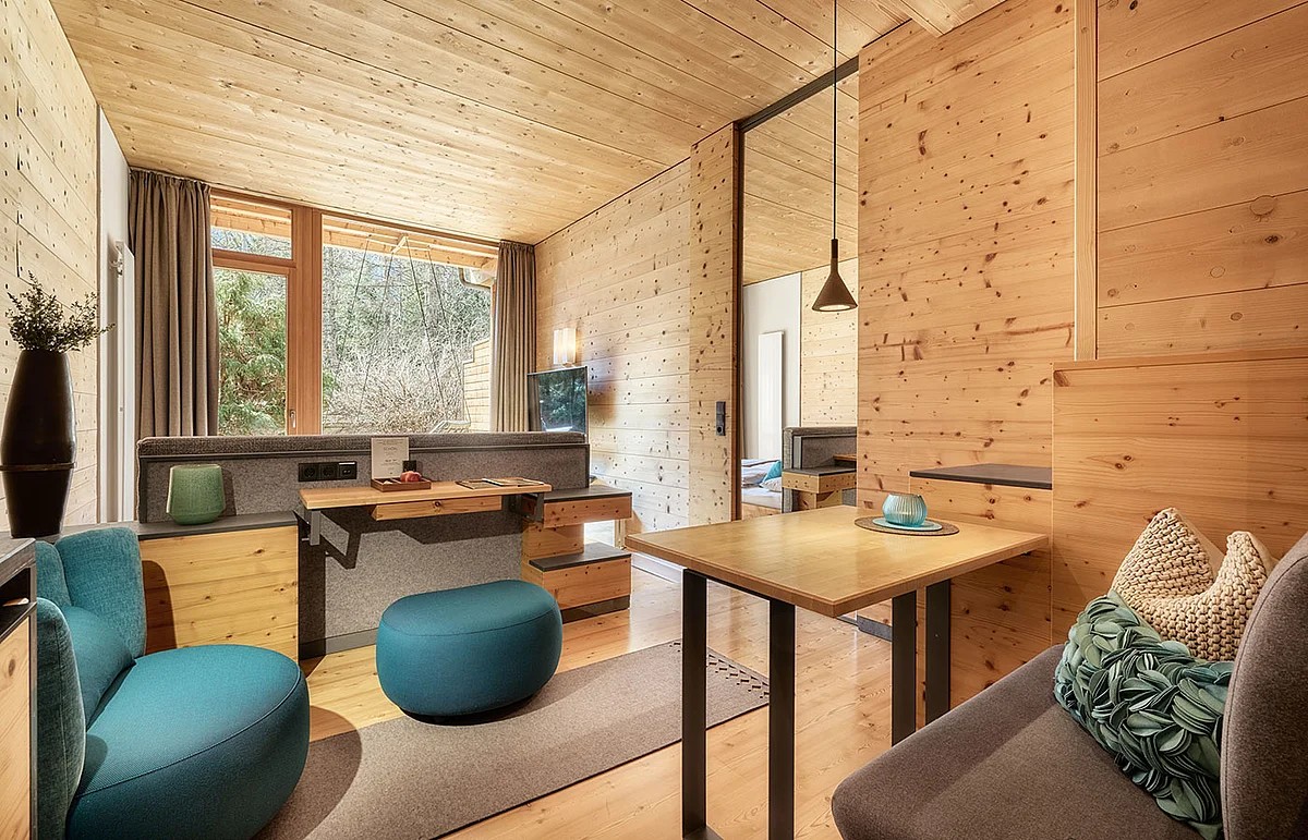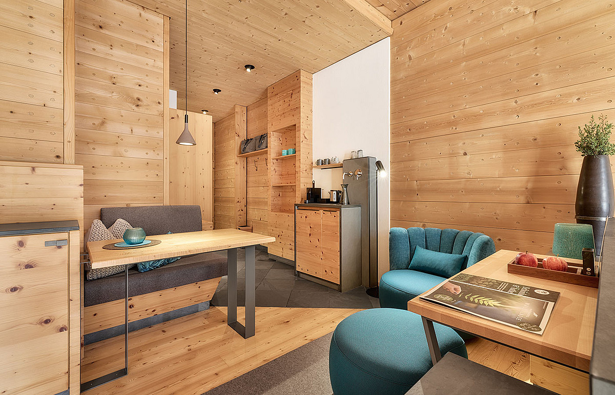 • Wohnbereich mit Tisch, Sitzbank und Ruhesessel